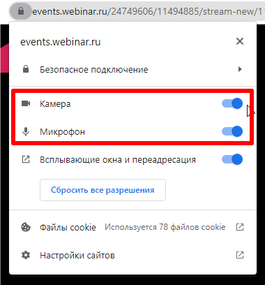 Нажмите на значок замка в адресной строке браузера и откройте доступы к микрофону и камере. Сделать это нужно один раз, дальше система будет помнить про эти разрешения.